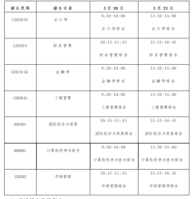 我校各招生专业将组织两场考试,考生可根据自身情况在系统中选择其中任意一场参加考试,考生系统选择确认考试时间后不予更改。正式考试时间为2022年3月20日、3月23日,各专业考试课程如下: