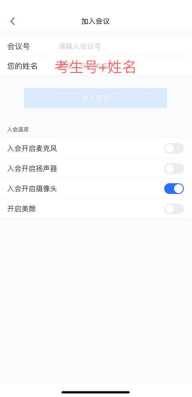 第二步,请考生务必提前查询准考证号,避免影响正式考试。考生输入会议号,“您的姓名”处填写考生号+姓名(如20230100101+张三),进入会议前先关闭麦克风和扬声器,需要打开摄像头,然后再点击进入会议。