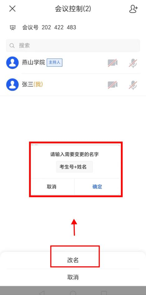 第二步,请考生务必提前查询准考证号,避免影响正式考试。进入会议后,点击“会议控制”,点击头像将登录名更改为考生号+姓名(如20250100101+张三),进入会议前先关闭麦克风和扬声器,需要打开摄像头,然后再点击进入会议。